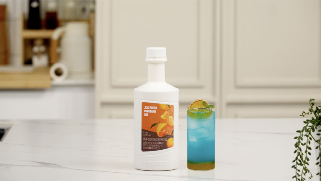 Naturetea Jeju Fresh Harubang Ade is a versatile base made from sweet Jeju tangerines, Hallabong oranges, and other fresh fruits. You can enjoy it with warm tea or cool ade, making it a favorite all year round.