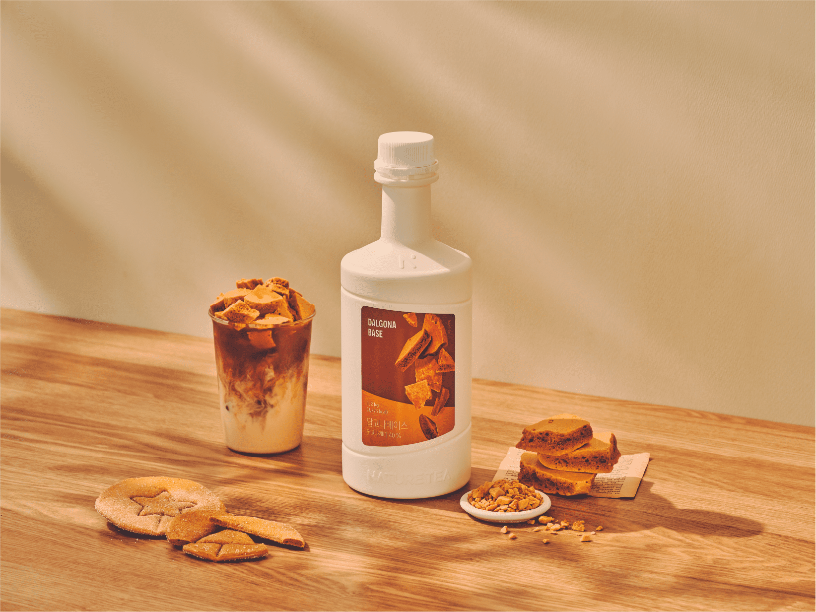 Naturetea Dalgona Base is a beverage base product that captures the unique sweetness and creamy texture of handmade dalgona, created during the process of making handmade dalgona. It perfectly combines the sweet taste and smooth flavor of homemade dalgona.