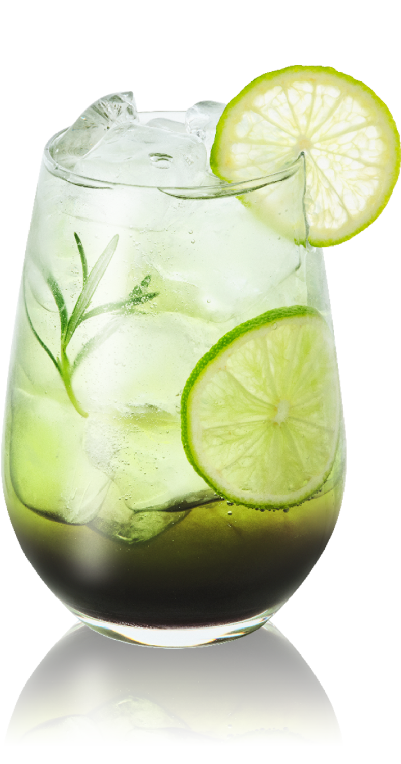 Garnish with lime slice and herb leaves.